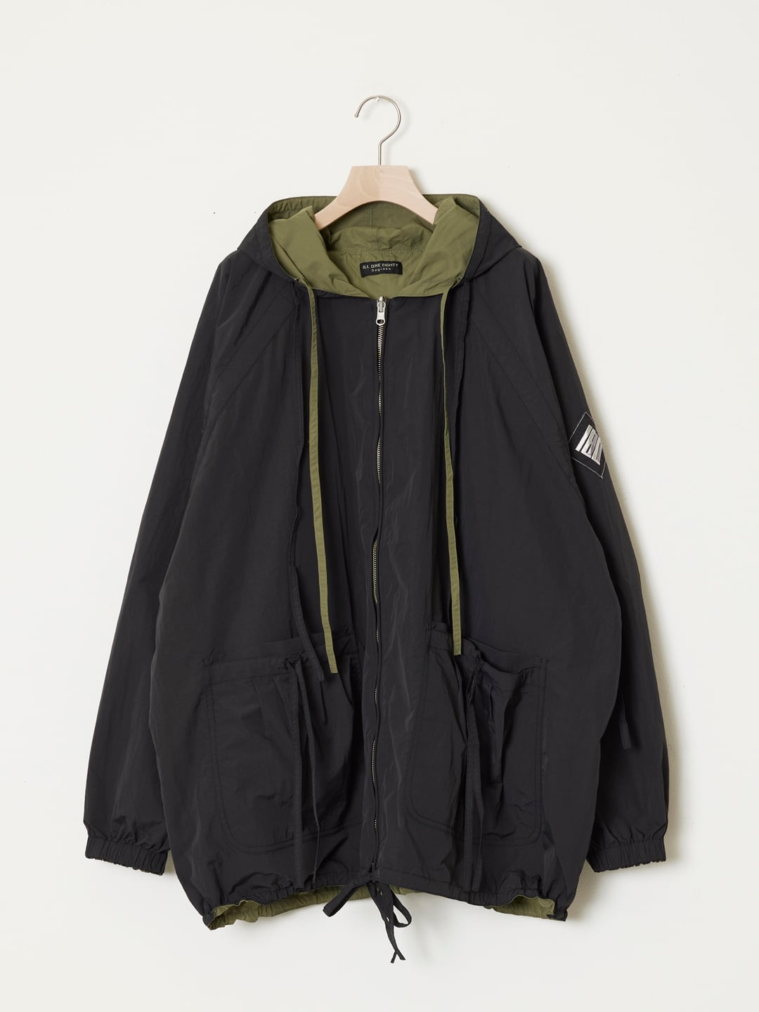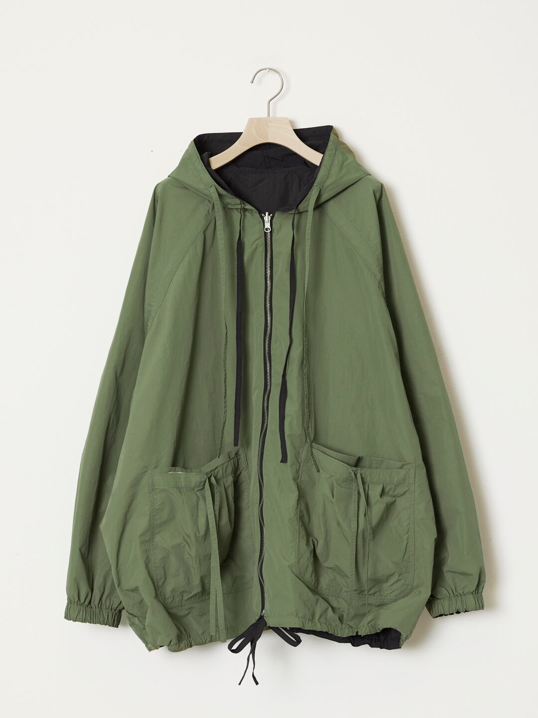 フード、脇下、ポケットや裾から⻑く垂れ下がるドローコードが