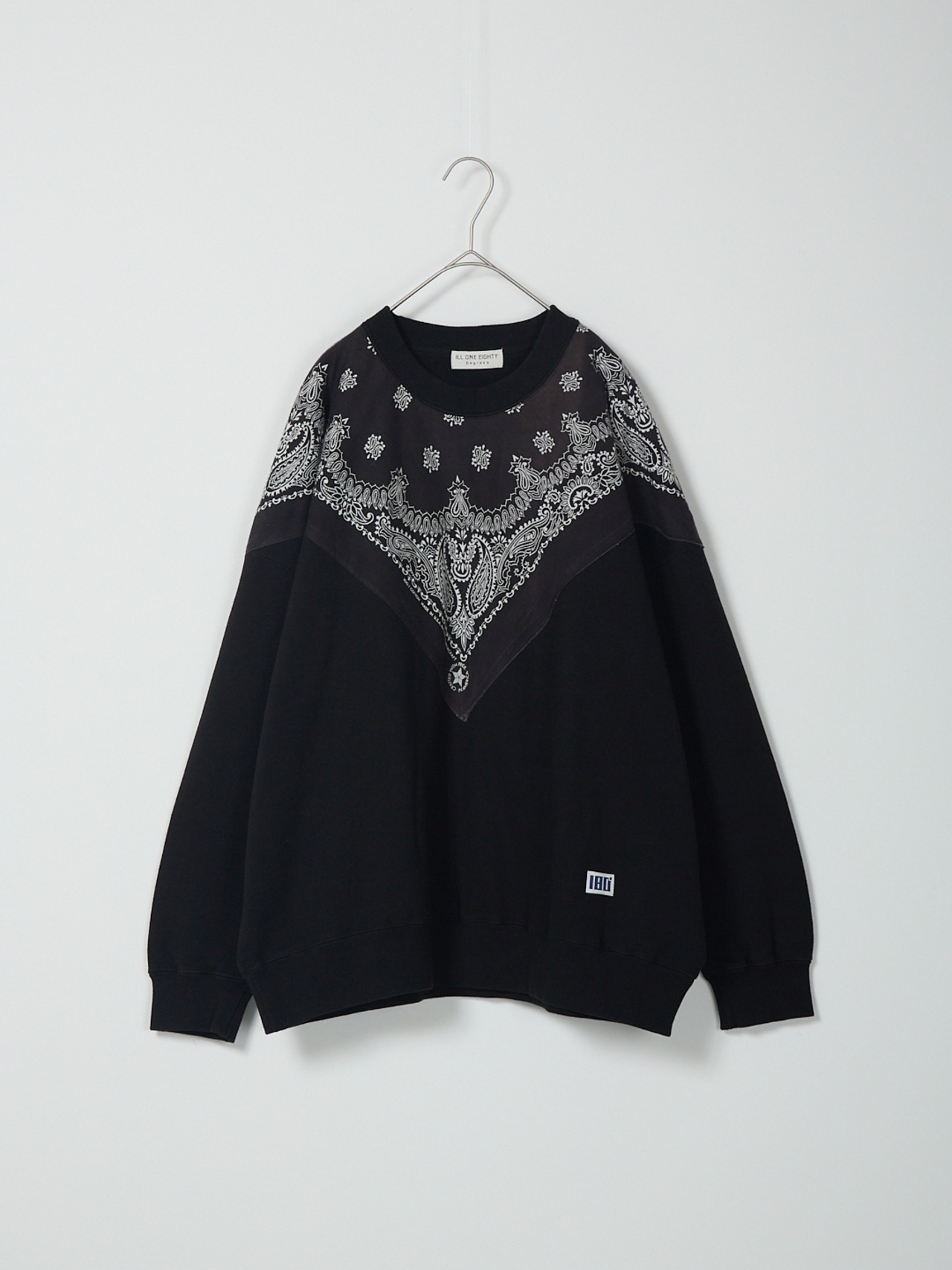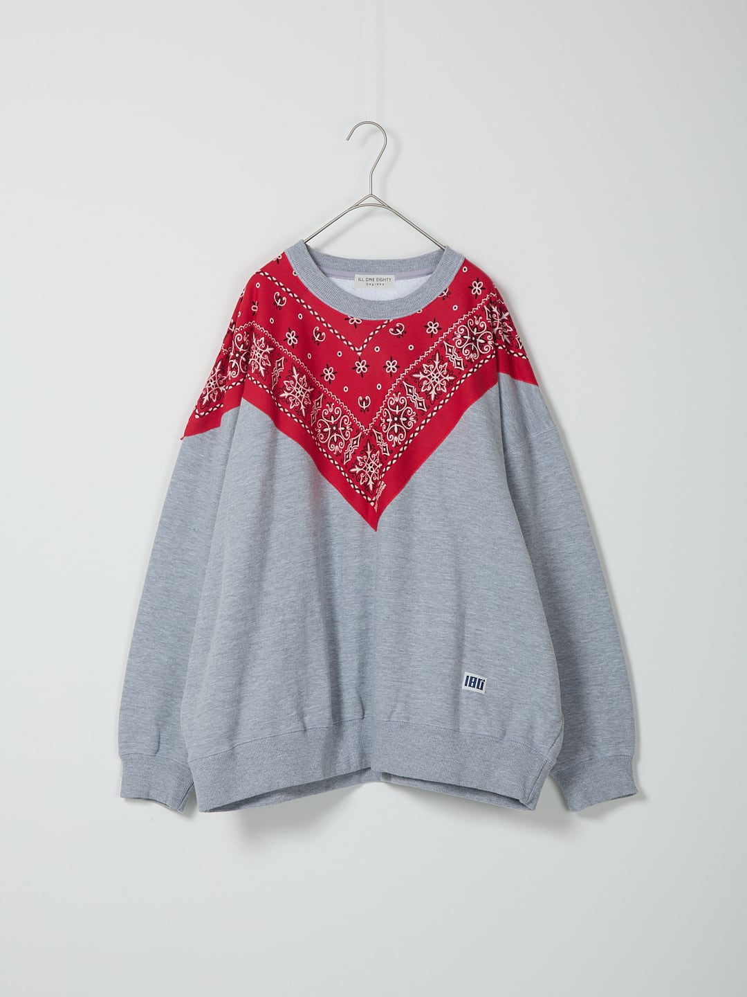 年々枯渇する希少なMADE IN USA、100% COTTONのヴィンテージバンダナのみを厳選し、贅沢に1枚使⽤しています。雪柄スウェットから着想し肩周りにバンダナを縫製したデザインで、1着1着異なる⾊柄が魅⼒的です。